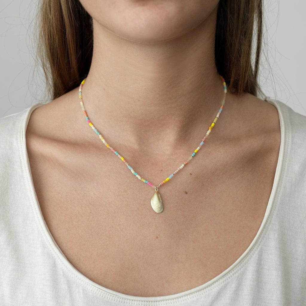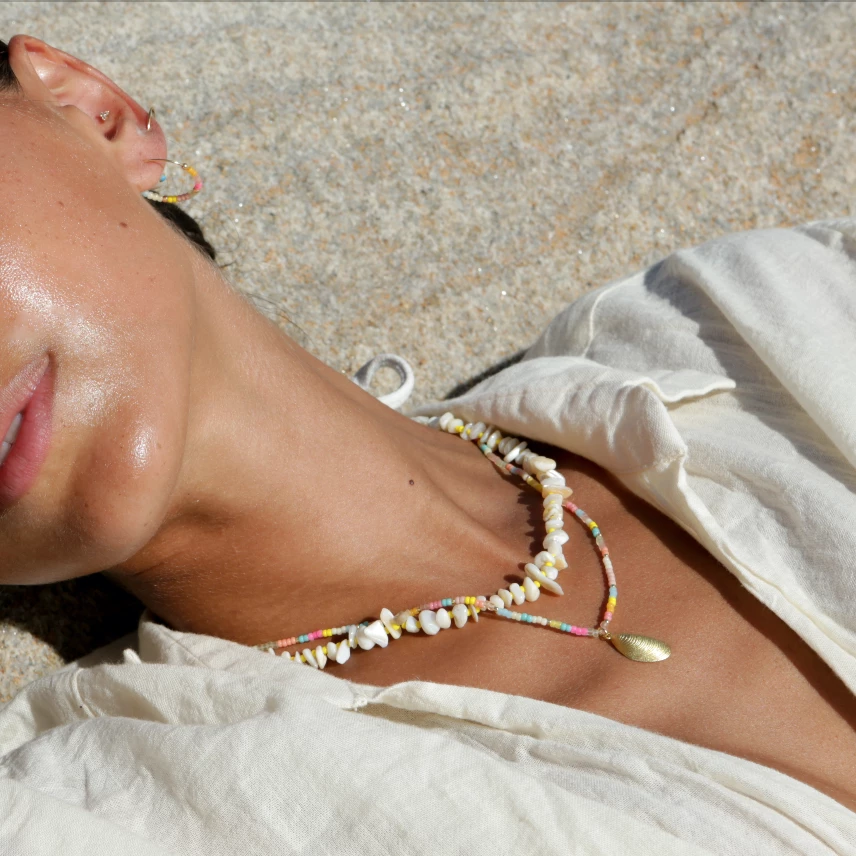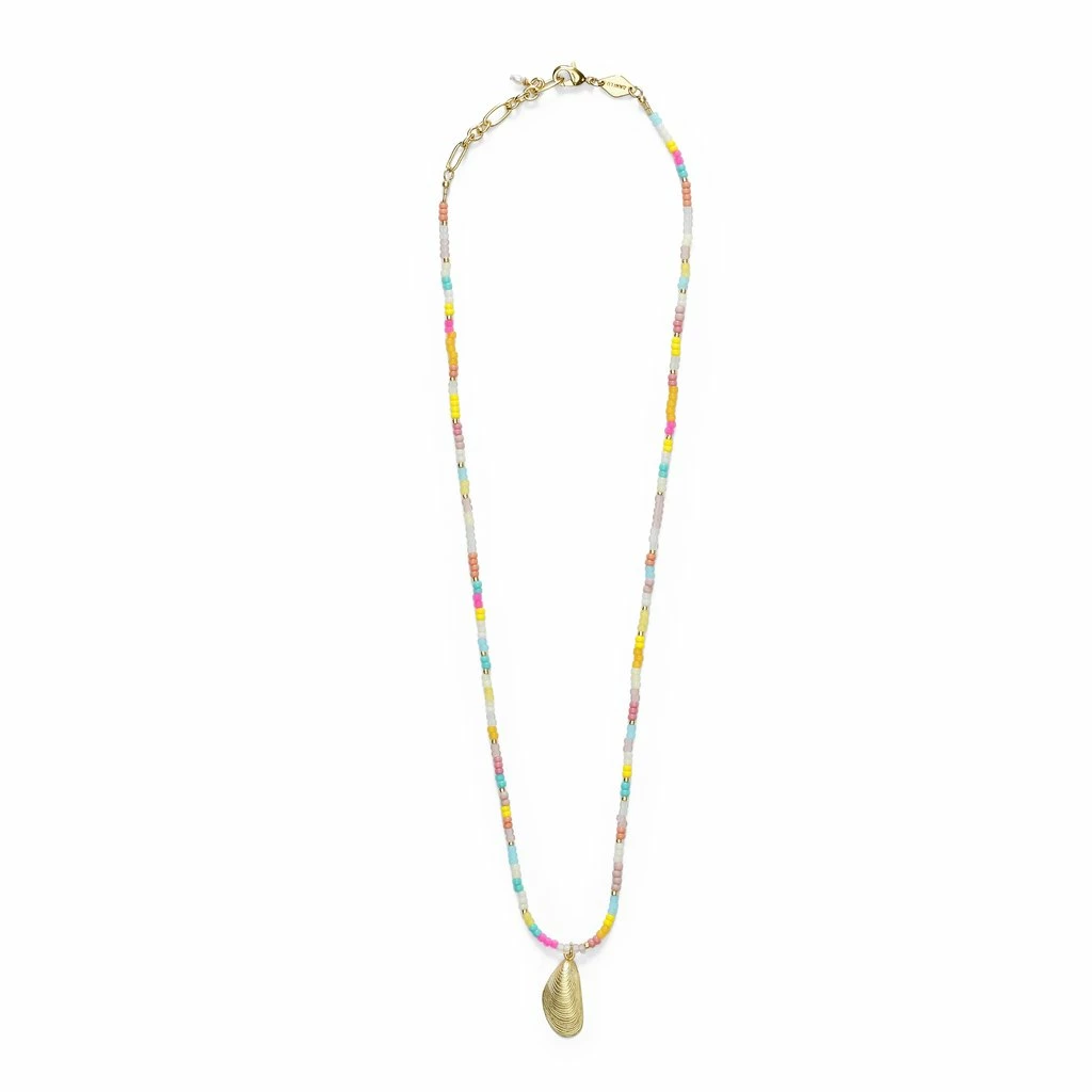 REBECCA’S NOTES The Eldorado styles have their own special place in the ANNI LU universe. And the new crispy candy versions are already a favourite at our beachfront office. 18k Gold Plated Brass + e Coating Glass Beads Chain Length 40.5-44cm Pendant 20x9mm Team with your more traditional gold jewellery for the perfect playful look.