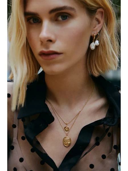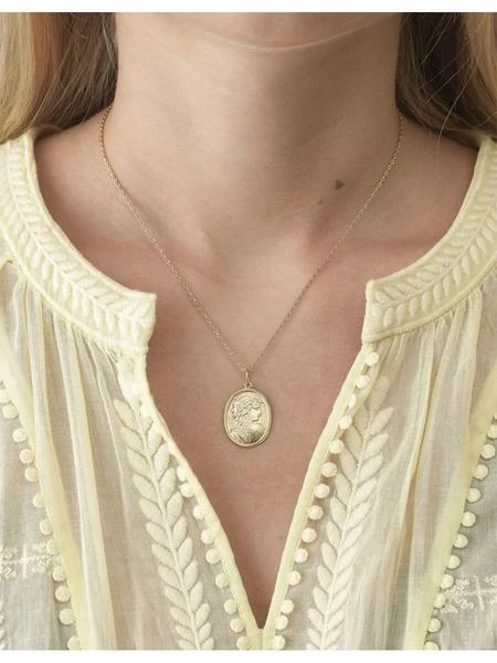 Made from an ancient cameo, that has been in the designer´s family for a century. It was lost for a number of years, but suddenly re-appeared. The inscription on the back, KEEP ME CLOSE, symbolizes the eternal love for our special ones, that we will never loose. Brass with 18kt gold plating. Detailed with a cubic zirconia stone. Length is 45 cm and pendant is 23 mm