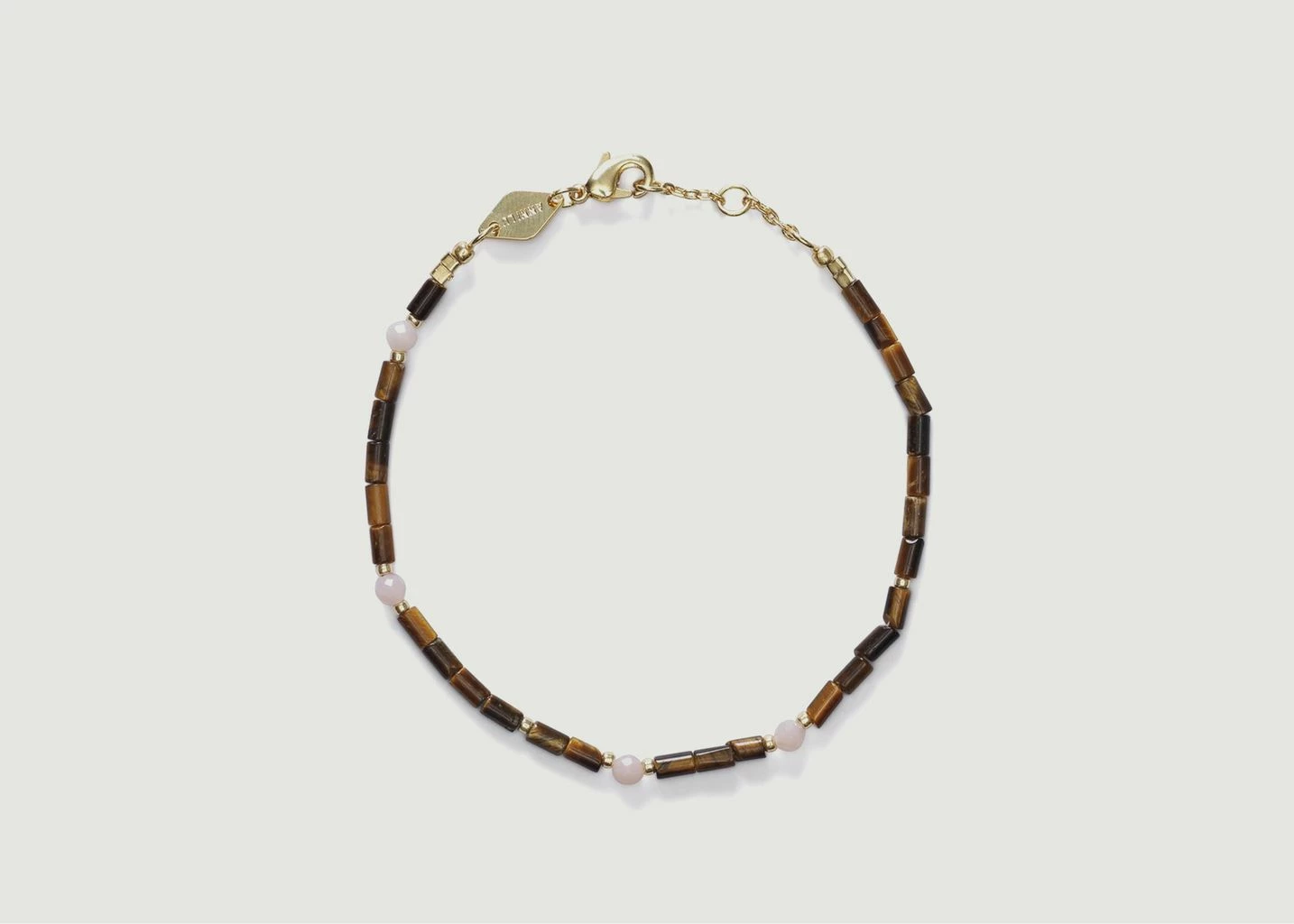 Thin bracelet in 18 carat gold plated brass, tiger eye and pink opal stone beads and cultured freshwater rice beads, adjustable hook and chain closure. Dimensions: 16-18 cm. To add a touch of fantasy while remaining elegant, choose the Eye of the Tiger bracelet signed Anni Lu! It will be able to be carried easily with the daily newspaper and why not to be carried in accumulation.