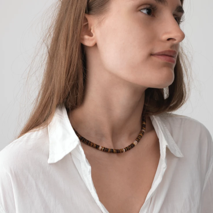 REBECCA’S NOTES Brown is the colour of… being transported back to 1978 and having a groovy and good time at a party in Monaco while sipping champagne with a crowd of celebrities. Crafted in Brass with 18ct Gold. Detailed in Tiger Eye Discs, Pink Opal Discs & Cultured Freshwater Rice Pearl. Necklace Adjusts From 40 – 46 cm. Perfect to be mixed with golden jewellery. Finished with a lobster clasp and a cultured freshwater rice pearl.