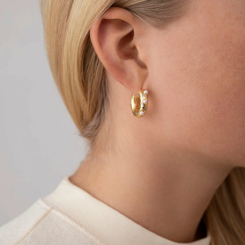 REBECCA’S NOTES Ready to pass down generation to generation, these organic and raw hoops combined with stunning pearls look like they could be a family heirloom. Crafted in Brass with 18ct Gold Plating + E Coating Detailed in Cubic Zirconia & Pearl Cabochons. Hoop 20 mm. Give them to someone truly special.