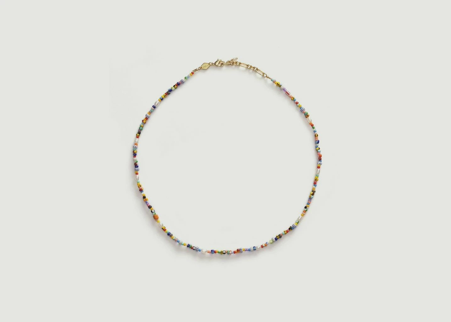 Necklace made of 18K gold-plated brass with cultured freshwater pearls, African glass beads and glass beads. Only the most daring surfers ride the Nuanua wave in Samoa. The same goes for the Nuanua models made from delicate glass beads. The necklace is adjustable from 40 to 46 cm. We love this pretty Petit Alaia necklace that will bring a touch of color to your neck for a resolutely summery look. Wear it alone on the beach and combine it with your classic jewelry for a fun evening.