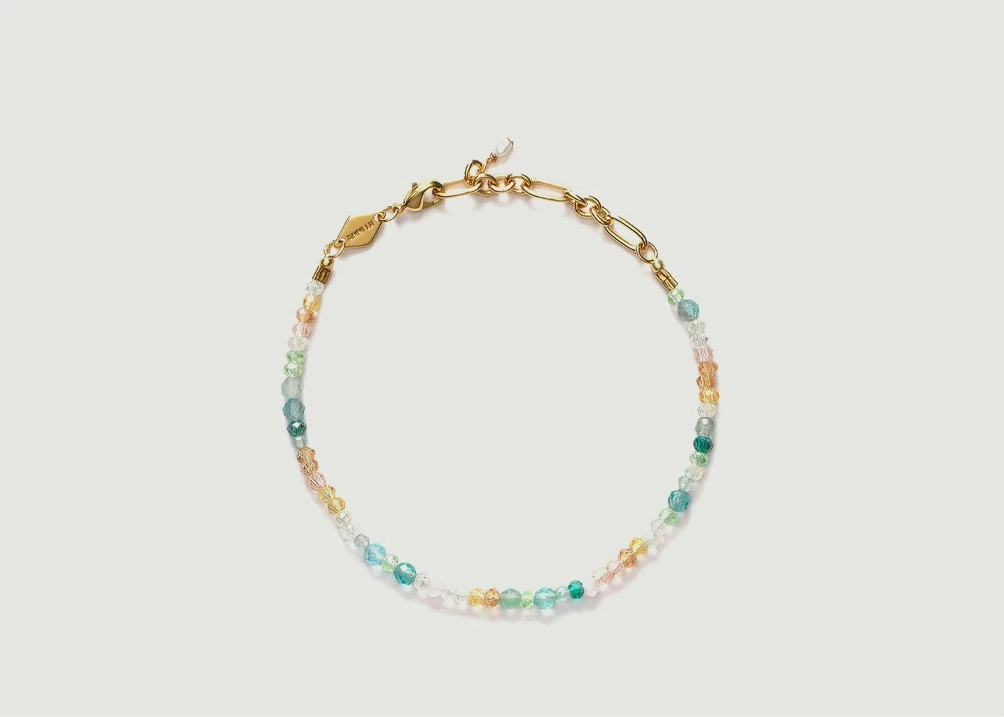 Thin 18K gold plated brass bracelet, multiple small pearls of different colors, adjustable hook and chain closure. Add a subtle touch of fantasy to your wrists with the Pfeiffer Beach d’Anni Lu bracelet ! We like this delicate model in pastel shades, ideal to bring a little cheerfulness to your looks.