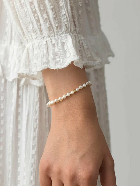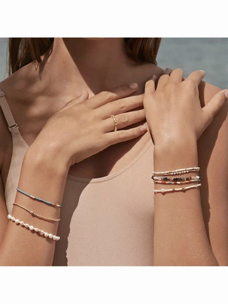 The Stellar Pearly Bracelet by Anni Lu, shows off cultured fresh water pearls separated by glass beads and a hammered gold bead on a gold chain. Wear alone or pair with other Anni Lu jewellery. Glass beads and cultured freshwater pearls Brass with 18-karat gold plating + e coating Hammered gold bead 3x5mm Lobster clasp with a cultured freshwater rice pearl Adjustable 17.5 – 20cm