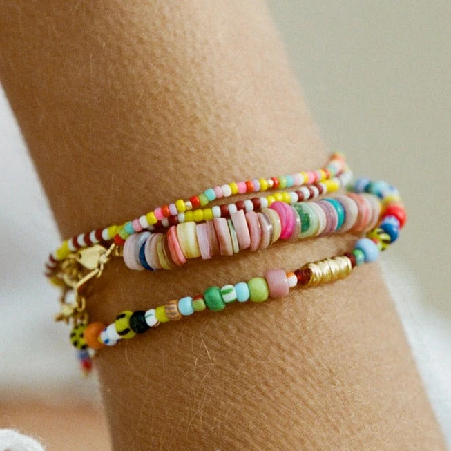 REBECCA’S NOTES The Tutti Frutti has two purposes in life: to look beautiful on your wrist in combination with other bracelets and to put a smile on your face. That’s it. Nothing more. Crafted in Brass with 18ct Gold Plating + E Coating Detailed in Glass Beads Bracelet adjusts from 16.5 – 18 cm We dream of the simple life!