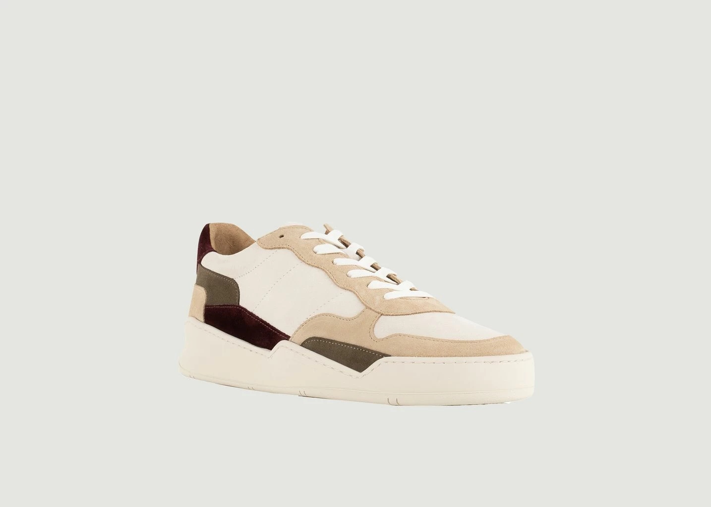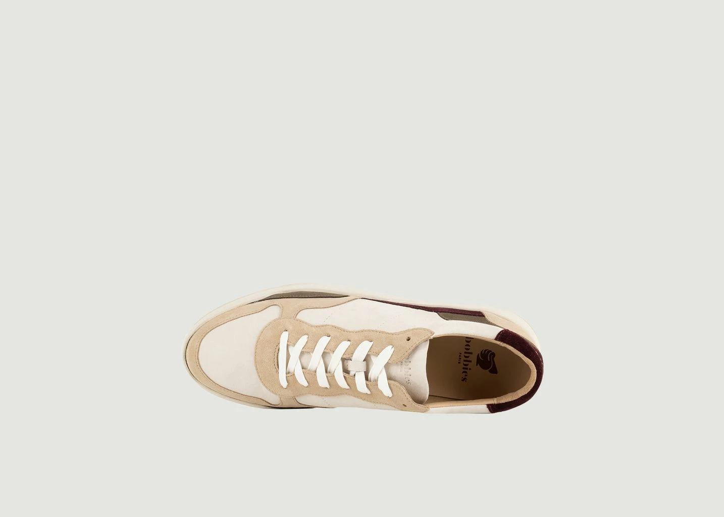Low sneakers in leather from Spain and suede from Italy, off-white and shades of burgundy and khaki, white laces under 7 eyelets, brand name embossed on the front tongue and printed on the heel, leather lining, two-tone rubber sole. Handcrafted shoes, assembled in a Strobel construction. For a trendy casual look, wear the Malibu sneakers by Bobbies ! We like this model with multiple patchwork-like inserts in different colors. These sneakers will be easily worn everyday, especially with all your jeans.