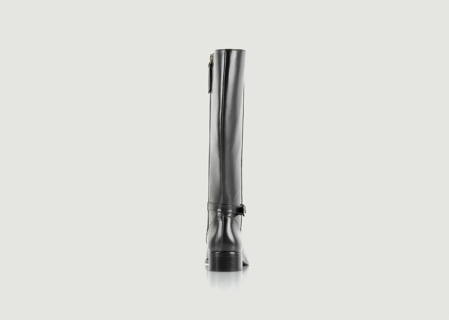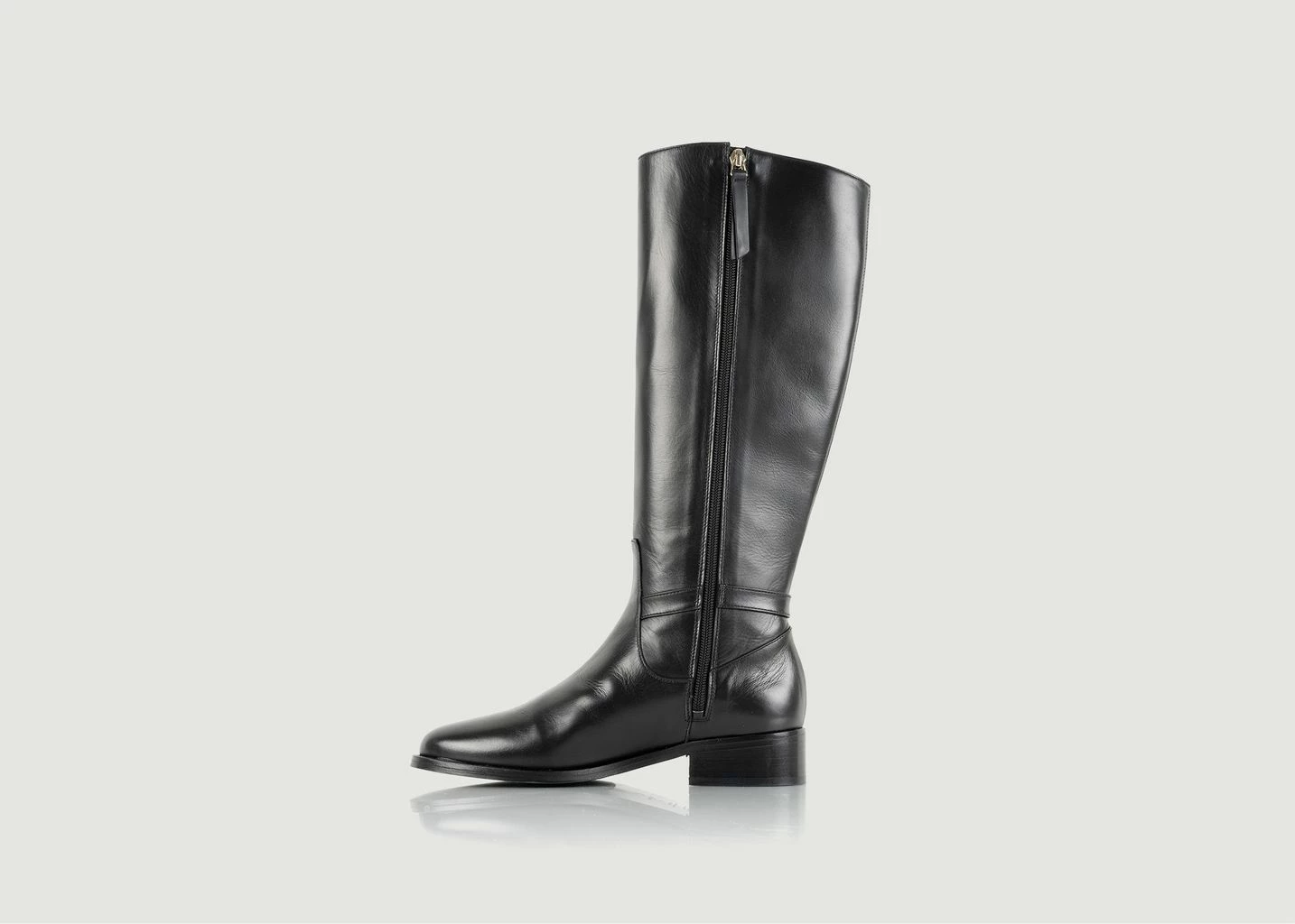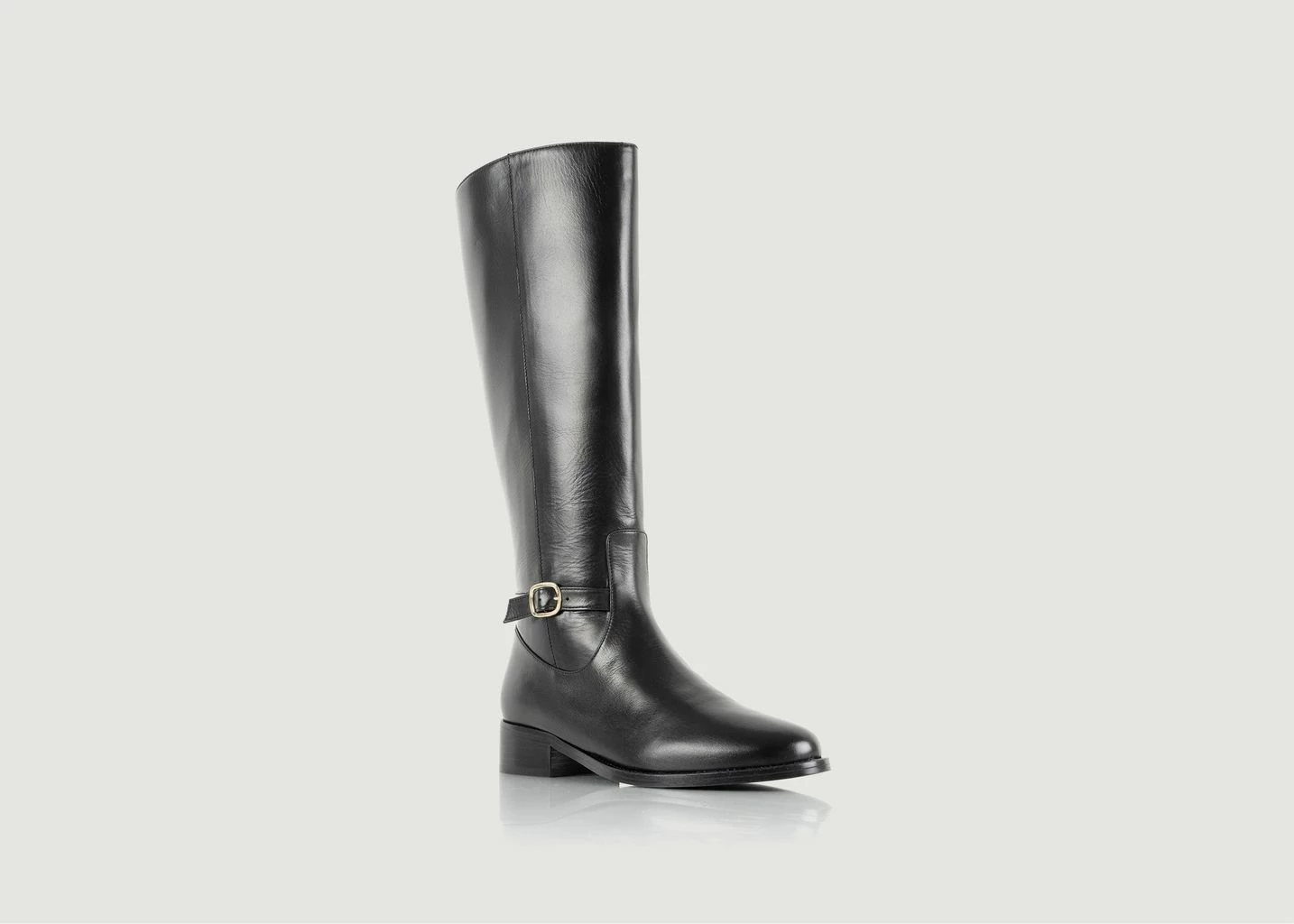 Black flat boots in smooth leather from Italy, branded seams, decorative belt tab on the outside, zipper on the inside, leather lining, leather sole with injected rubber pad. Handmade shoes. Upper height: 37 cm, heel height: 3 cm. Adopt without hesitation the Bobbies Paris riding boots, timeless shoes to have in your closet. With their minimalist lines and sober colors, these flat boots will be easily worn everyday. Pair them with a casual dress or skinny jeans.