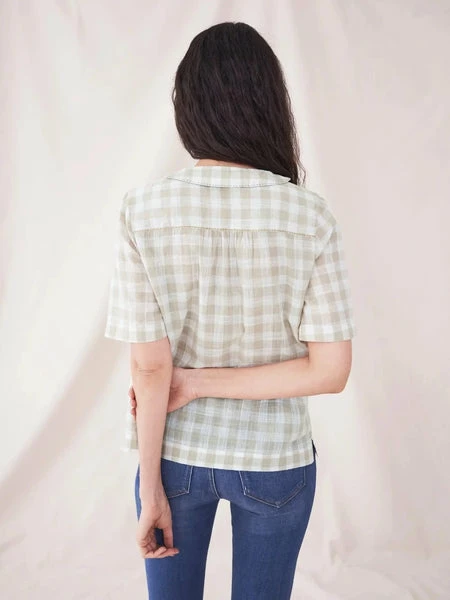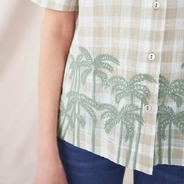 A short sleeve check shirt with an embroidered palm tree trim and a delicate rounded collar. Product ID: 435978 Main: 100% Cotton, Embroidery: 100% Polyester Model wears a size 10 and is 5′ 9″/175cm Size 12 high shoulder neck point to hem approx. 64cm Collar Check Machine Washable Women’s General Size Guide UK UK EU DE US BUST WAIST HIPS 6 XS 34 32 2 31 in/ 78 cm 23 in/ 58 cm 34 in/ 86 cm 8 S 36 34 4 33 in/ 83 cm 25 in/ 65 cm 36 in/ 91 cm 10 S 38 36 6 35 in/ 88 cm 27 in/ 70 cm 38 in/ 96 cm 12 M 40 38 8 37 in/ 93 cm 29 in/ 75 cm 40 in/ 101 cm 14 M 42 40 10 39 in/ 98 cm 31 in/ 80 cm 42 in/ 106 cm 16 L 44 42 12 41 in/ 103 cm 33 in/ 85 cm 44 in/ 111 cm 18 L 46 44 14 43 in/ 108 cm 35 in/ 90 cm 46 in/ 116 cm 20 XL 48 46 16 45 in/ 114 cm 37 in/ 96 cm 48 in/ 122 cm 22 XL 50 48 18 47 in/ 120 cm 39 in/ 102 cm 50 in/ 128 cm