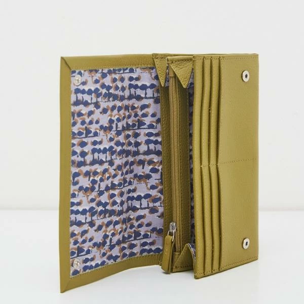 100% leather purse. Two zipped sections, two note compartments and six card slots. Printed lining – watercolour painting-inspired. A stylish, keep forever classic you’ll love. *Press stud closure Colour: MID CHART 100% Leather 100% cotton lining 19.5cm width 10.5cm height Do Not Wash